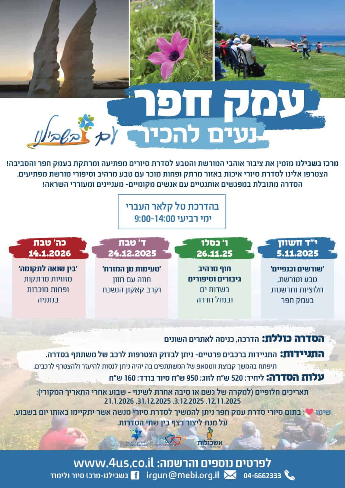 מרכז בשבילנו מזמין את ציבור אוהבי המורשת והטבע לסדרת סיורים מפתיעה ומרתקת בעמק חפר והסביבה!